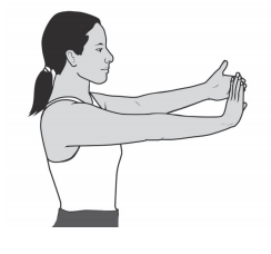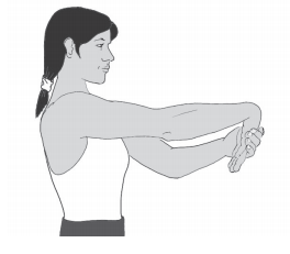 Straighten the arm and bend the wrist backward so your fingers face either the ceiling or the floor, as per the images below. Use your opposite hand to pull the fingers of your stretching hand backward until you feel a stretch on the inside of the forearm. Hold this position for 15 seconds and then switch to the other arm Do this 5 times for each arm once an hour